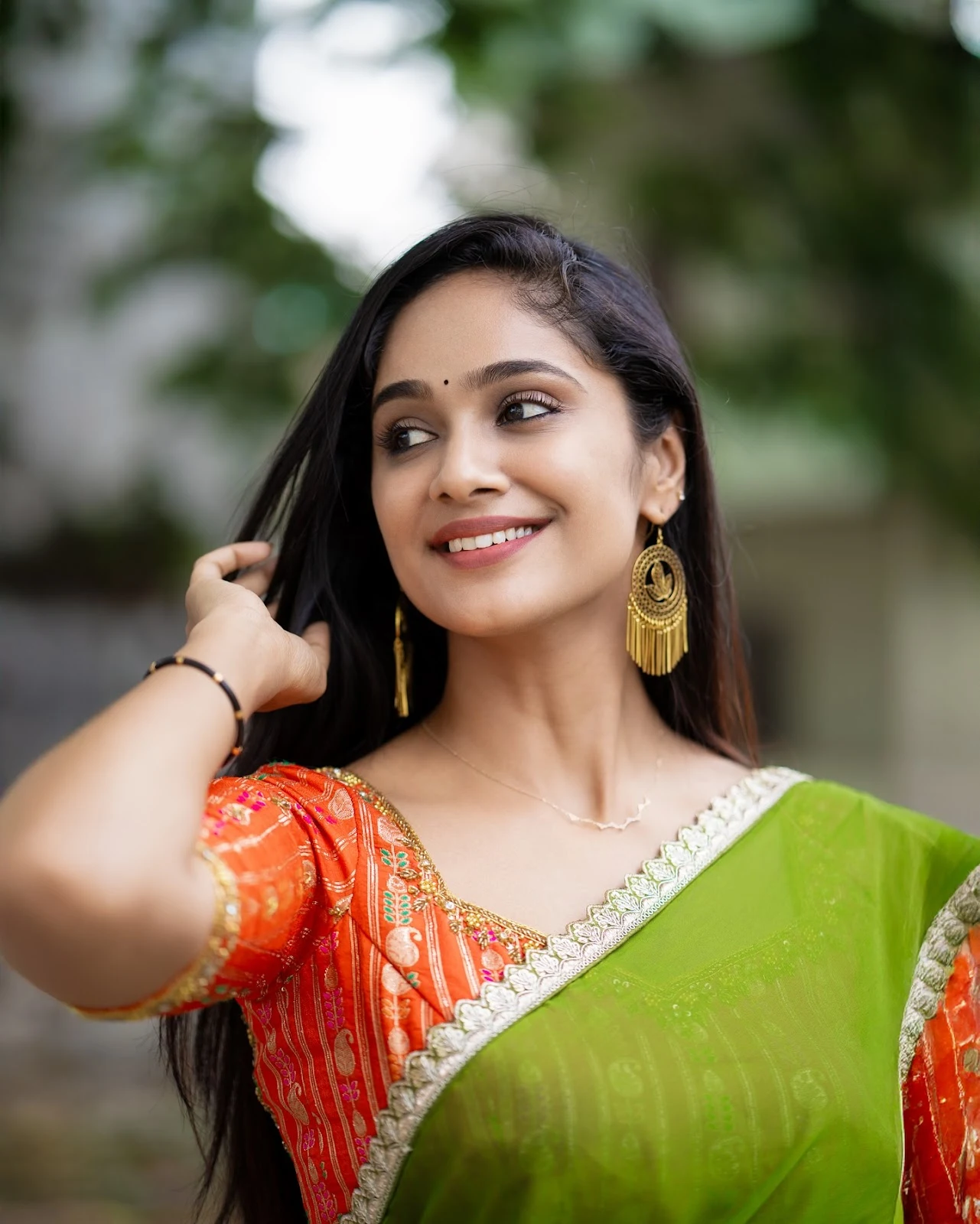Tejashwini Gowda Wearing Green Saree Orange Blouse
